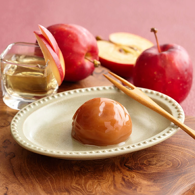 ひとくち食べた瞬間に、りんご酢の香りが鼻を通り抜け、口いっぱいに甘酸っぱさが広がります。出来立てはりんご酢の酸味が効いたお味で、熟成すると酸味が緩和され甘さがより感じられるお味になります。