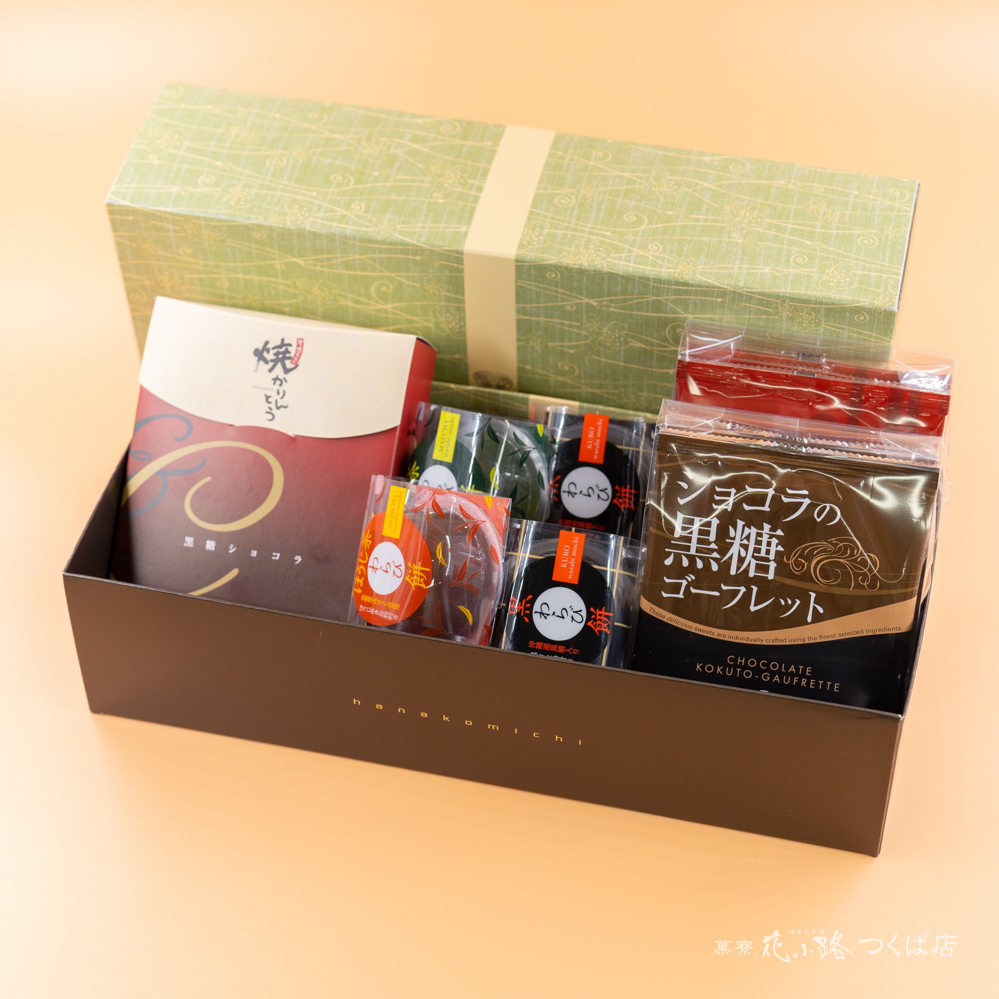3種類の「わらび餅」4個(黒糖2個、抹茶1個、ほうじ茶1個)と、花小路の人気商品「ゴーフレット」。更に季節限定「ショコラ焼かりんとう」と詰合せにしました。